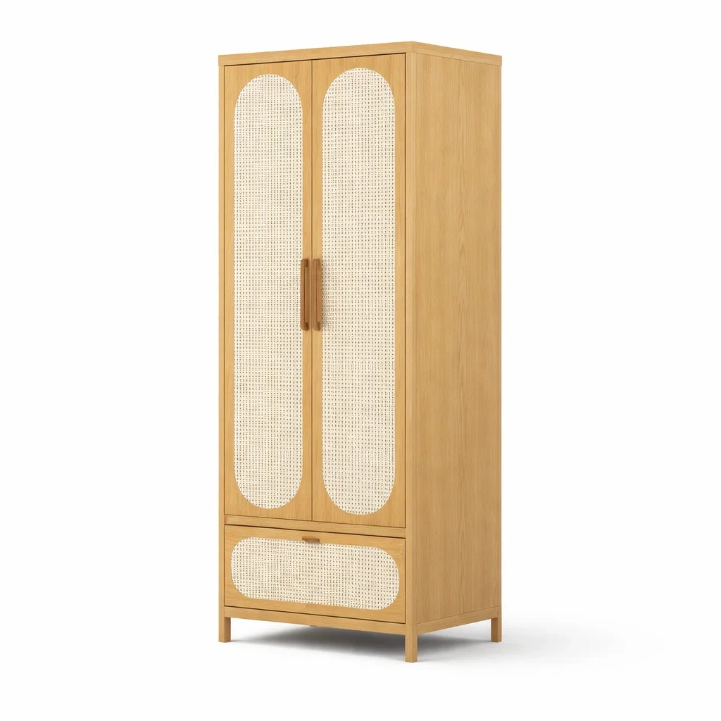 Kleiderschrank aus Holz mit Rattan Türen zwei Türen mit Schublade Natur