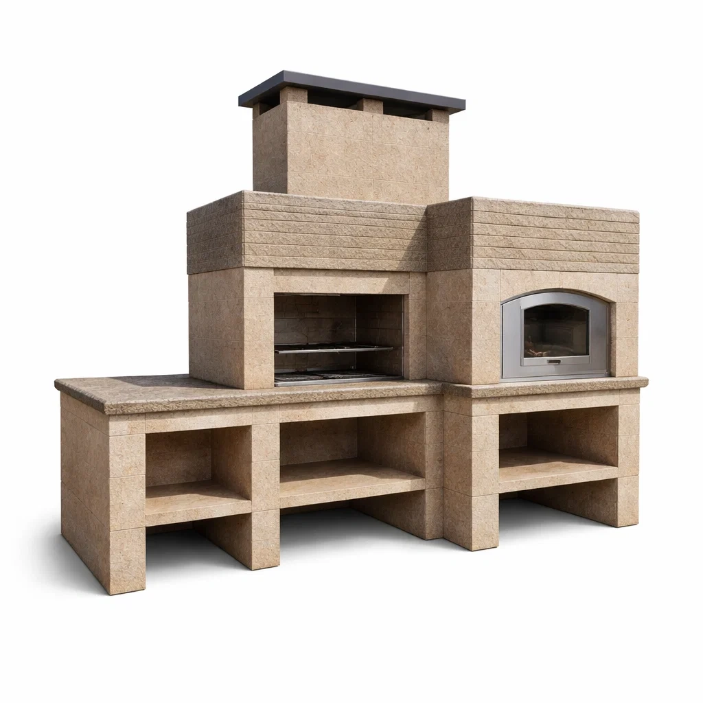 Das Grill- und Backofenset für den Außenbereich besteht aus robustem Granit. Der Innenraum des Grills ist mit einem Edelstahlrost ausgestattet. Der Granit ist poliert.