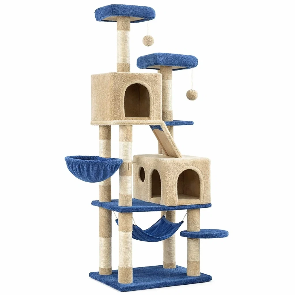 Dieser Kratzbaum besteht aus stabilem Seil aus natürlichem Sisal und weichem Synthetikplüsch. Er ist in Beige und Blau erhältlich und hat eine Gesamthöhe von etwa 150 cm mit einer Bodenplatte von 50 x 50 cm. Der Baum umfasst mehrere Plattformen, Schlafhäuser, eine Hängematte und Kletterstangen, ideal für Katzen verschiedener Größen.